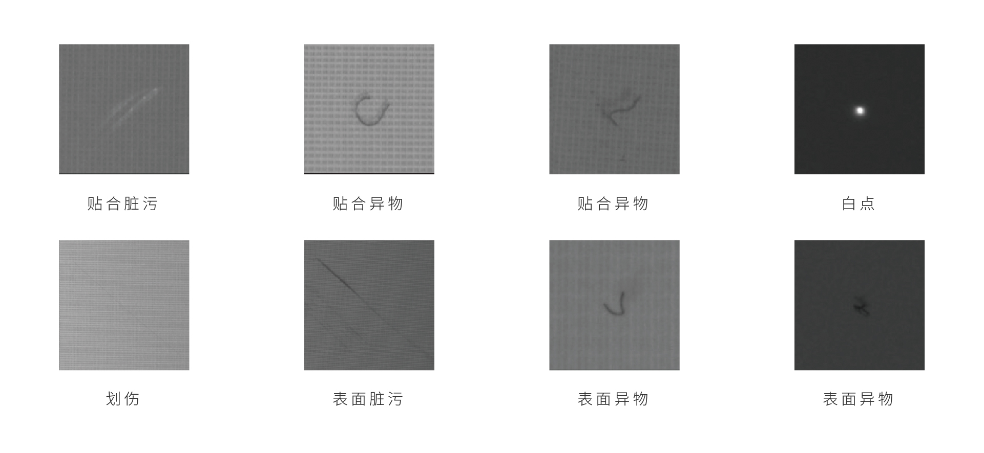 脏污、气泡、白点、划伤、异物、贴合偏移等